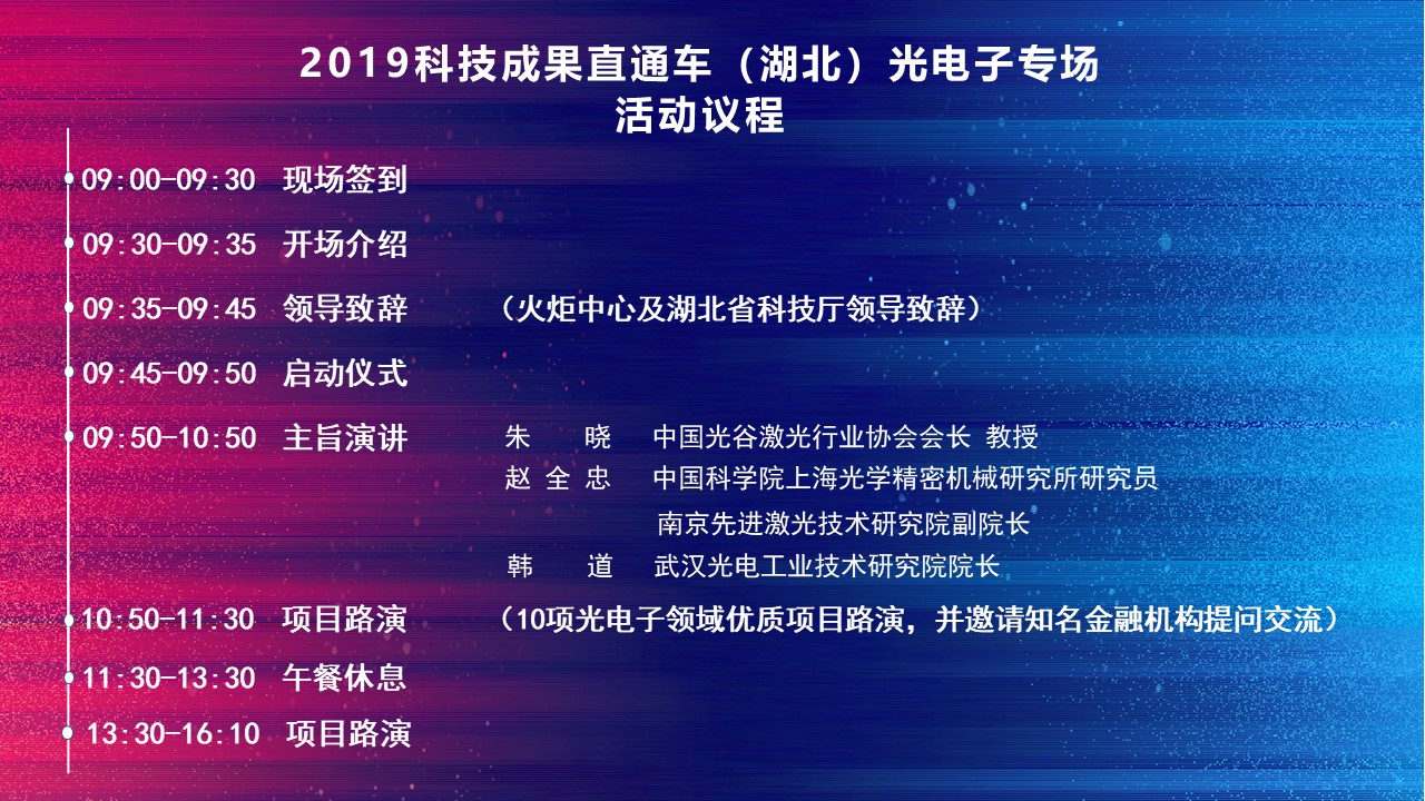 本次2019科技成果直通车(湖北站)光电子专场活动将聚焦湖北特色产业——光电子,积极发挥湖北科技创新与金融服务能力,探索高水平科技成果与企业实际需求的精准对接,为光电子领域相关科技成果的加速产业化搭台赋能,促进光电子领域科技成果转化落地。