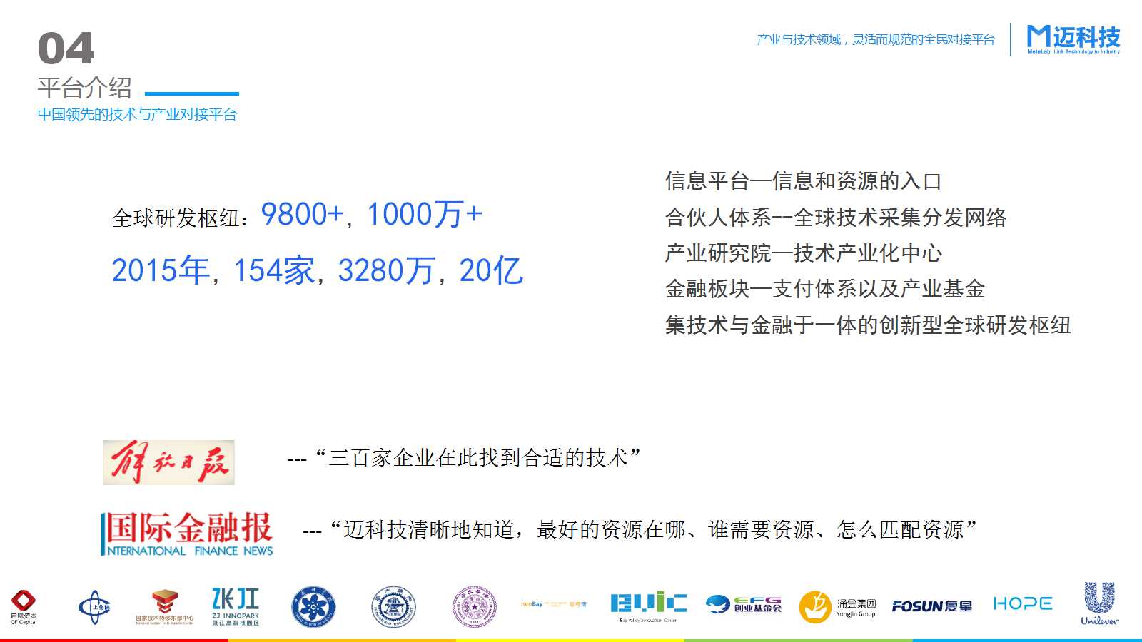 然后,从信息平台、合伙人体系、产业研究院、金融板块四大模块,向现场来宾介绍了迈科技——一个集技术与金融于一体的创新型全球研发枢纽。