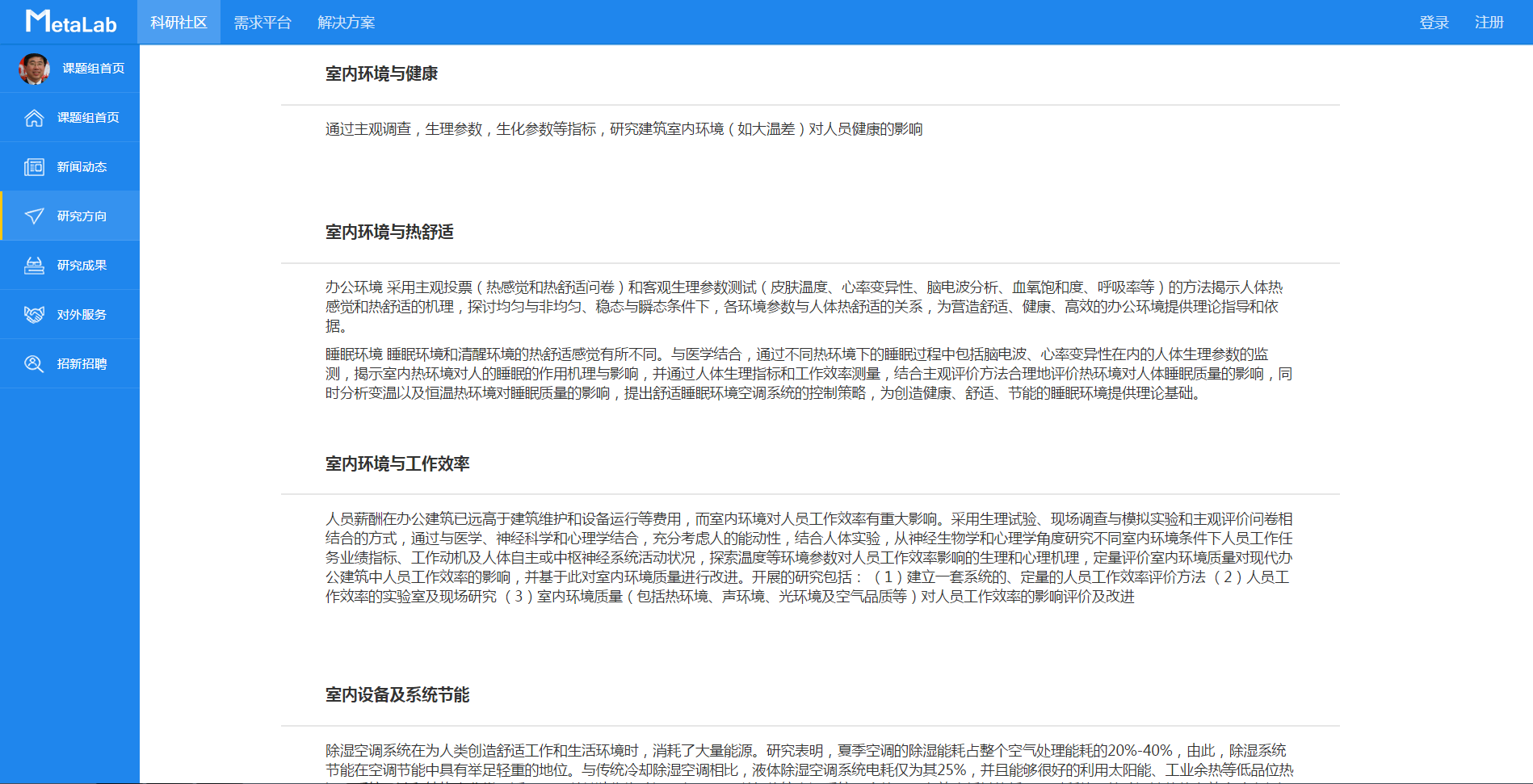 上海交通大学建筑学系连之伟教授一直从事建筑环境与设备工程专业(原暖通空调专业)的教学及科研工作。先后在空调房间下部送风机理、负荷、气流组织,热舒适,室内空气品质改善,建筑节能及热泵的应用等方面都做了深入研究,在室内环境领域处于国内领先地位。作为上海市制冷学会理事,国际交流委员会副主任的他同时也是“迈科技”的资深用户和特聘专家学者。本次我们有幸联系到了连之伟教授,并在他的热心支持下整理出了此篇案例,从而向广大用户分享他如何通过“迈科技MetaLab”高效地管理课题组信息发布和对接企业技术需求。