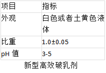 新型高效破乳剂为该公司自主研发的一种高效水溶性破乳剂,能与水以一定的比例互溶。该破乳剂含有高效能的表面活性物质,具有更高的活性,该破乳剂能迅速地穿过乳状液外相分散到油水界面上,替换或中和乳化剂,降低乳化水滴的界面张力和界面膜强度,界面膜在外力作用下极易破裂,从而使乳状液微粒内相的水突破界面膜进入外相,从而使油水分离。 不仅可以破坏已经形成的原油乳状液,还可以防止油水混合物进一步乳化,起到降低油水混合物黏度和加速油水分离的作用。具有较强的破乳及絮凝功效,对于含油废乳化液,可实现快速破乳及絮凝,COD去除率高、除油以及絮凝效果好。